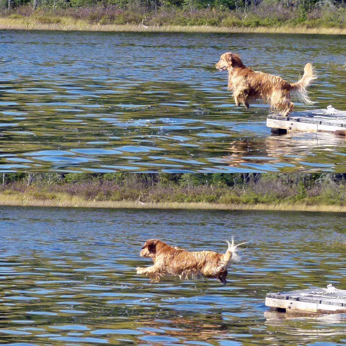 When Steve returned from fishing we'd play with the pups. We had a thought to see if Alf would dive from the dock ... ya think? He was like a little kid, running down the length of the dock and flinging himself into the water. I took this series of pictures with my camera on burst mode ...